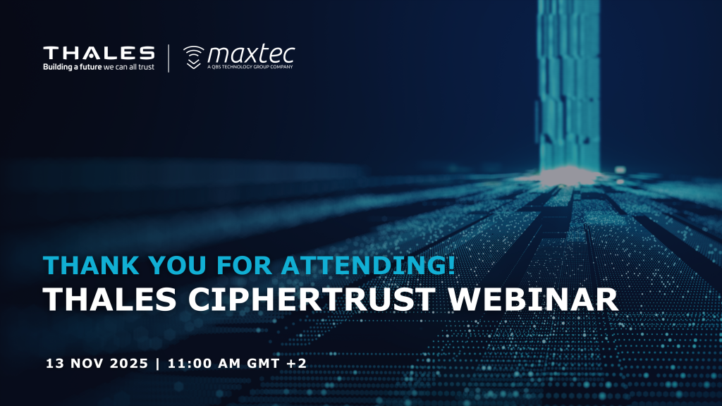 We hope you found the session insightful and learned how Thales can help you simplify compliance, enhance data protection, and unlock new revenue streams.Please use the form on this page to request a follow-up meeting, a technical workshop or a 90-day trial. We can also assist with NFR licensing and training for your team. Maxtec offers an array of solutions via our partners and resellers – from Discovery and Classification to file-level encryption, tokenization, and multi-cloud key management, we’d love to help you achieve your cybersecurity goals.